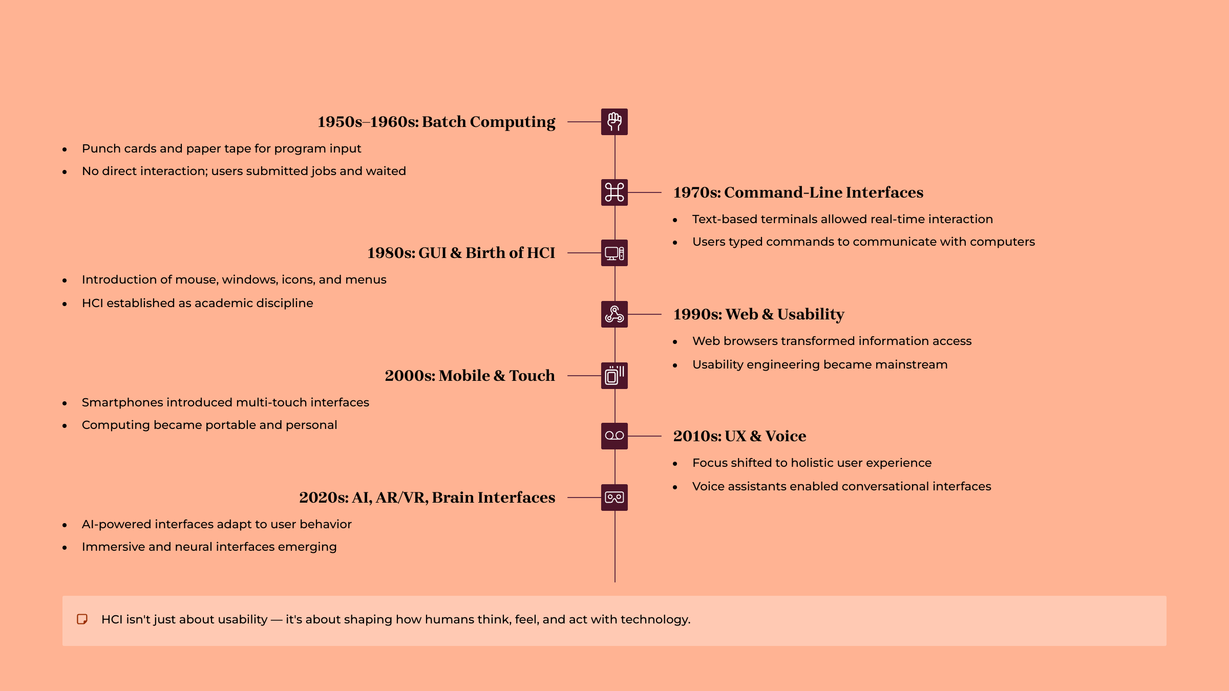 The history of HCI is really a history of how humans extend their capabilities through machines. Each shift, from batch jobs to predictive AI, brings new opportunities and new responsibilities. It’s no longer just about building usable systems. It’s about asking: how do we shape technology that understands, empowers, and respects the people who use it?